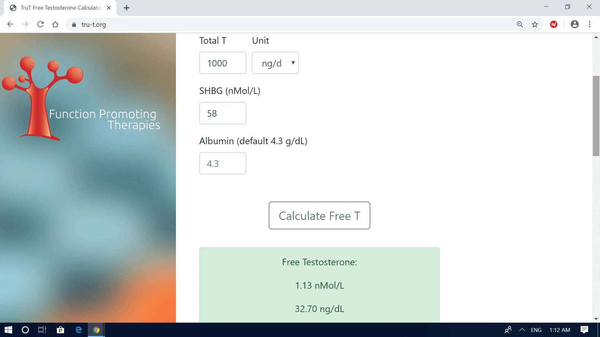 As an example if one has an SHBG level of 58 nmol/L (high) than using the newer calculated TruT method one would only need to hit a TT level of 1000 ng/dL to achieve a FT level just slightly over the top end of the reference range of 16-31 ng/dL.