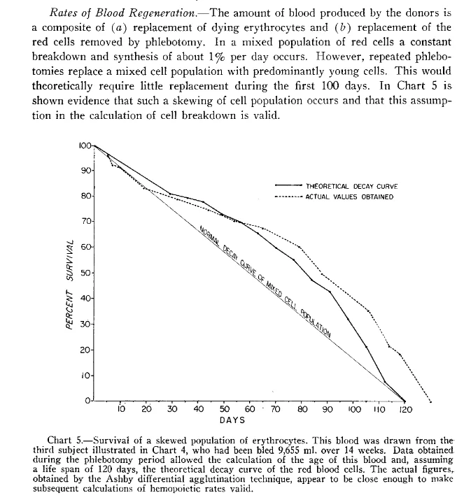 Human red blood cells (RBC), after differentiating from erythroblasts in the bone marrow, are released into the blood and survive in the circulation for approximately 115 days. In humans and some other species, RBC normally survive in a nonrandom manner. This means that all of the RBC in an age cohort are removed by the reticuloendothelial system at about the same time. In practice there is considerable variation in the lifespan of human RBC. In a normal individual with a mean RBC lifespan of 115 days, this value may vary between 70 and 140 days [1, 2]. Among individuals the mean lifespan varies by approximately ±15% [1]. As discussed below, there are circumstances in which even this relatively small normal variation can be important.