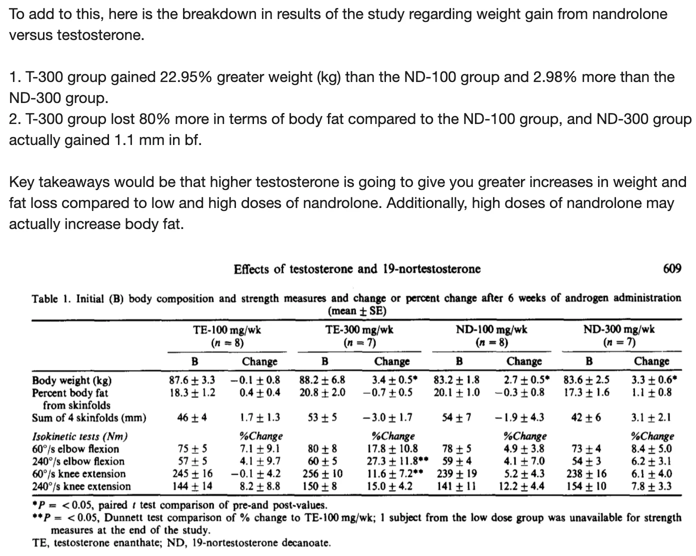 Vital pieces of information you are leaving out. The study I presented demonstrated both a substantial increase in body weight in the testosterone group versus the nandrolone group, as well as a significantly greater loss in body fat. That would conclude a greater increase in fat free mass in the participants in the T group over the N group.