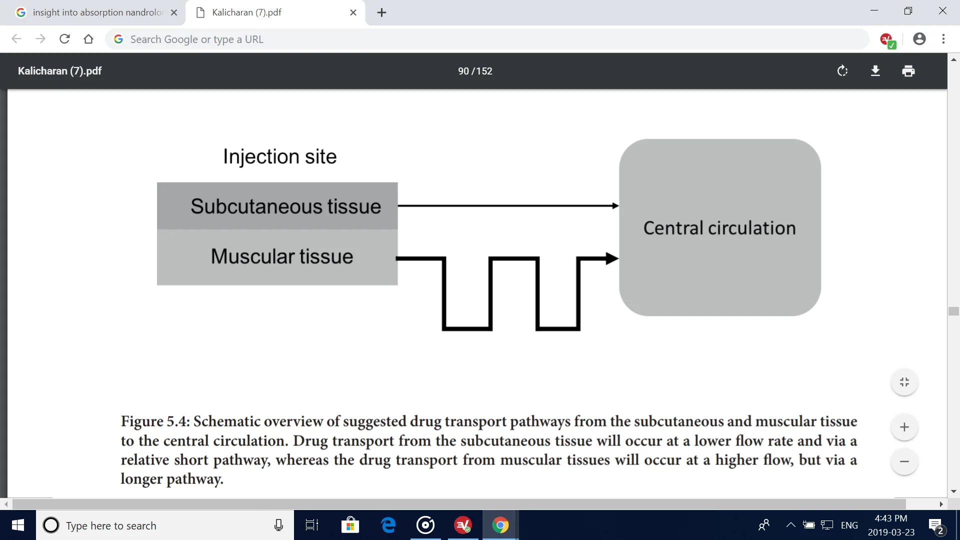 The open ends of the current research have been indicated above. Both the fate of the oil and the role of the immune system towards drug absorption are still not fully understood. In future research, an option to examine drug release and absorption from an oil depot can be performed with a traceability in vivo study. Ideally, 3 tracers would be integrated in the drug product: 1 in the triglyceride structure of the oil components, 1 in the nandrolone molecule and 1 in the decanoic acid moiety. The distinctiveness between these three tracers and between the tissues must obviously be sufficient enough to determine the three compounds separately. The whole process of drug release, hydrolysis and oil digestion could then be followed. Nowadays, traceability studies can be performed for instance with Single-photon emission computed tomography (SPECT) or PET/MRI-scanners. These imaging techniques use respectively isotopes or fluoride-atoms to visualise compounds in situ. Unfortunately, these labeling materials are unsuitable to use in the suggested traceability study, because these materials will alter the physical-chemical properties of either the oil formulation or the prodrug compound. This may change the oil viscosity, drug partition coefficient, spatial distribution in administered tissue or immune response, which may consequently influence the biopharmaceutical aspects of drug absorption from oil depots when these materials are not applied.