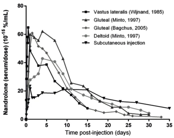 Below is a graph from the work referenced by @madman. This give a feel for the kinds of differences you can expect with different injection sites and methods. This is using nandrolone decanoate, and suggests a much longer half-life for subQ. In the Antares study the half-life for subQ T enanthate was about 50% longer than for IM.