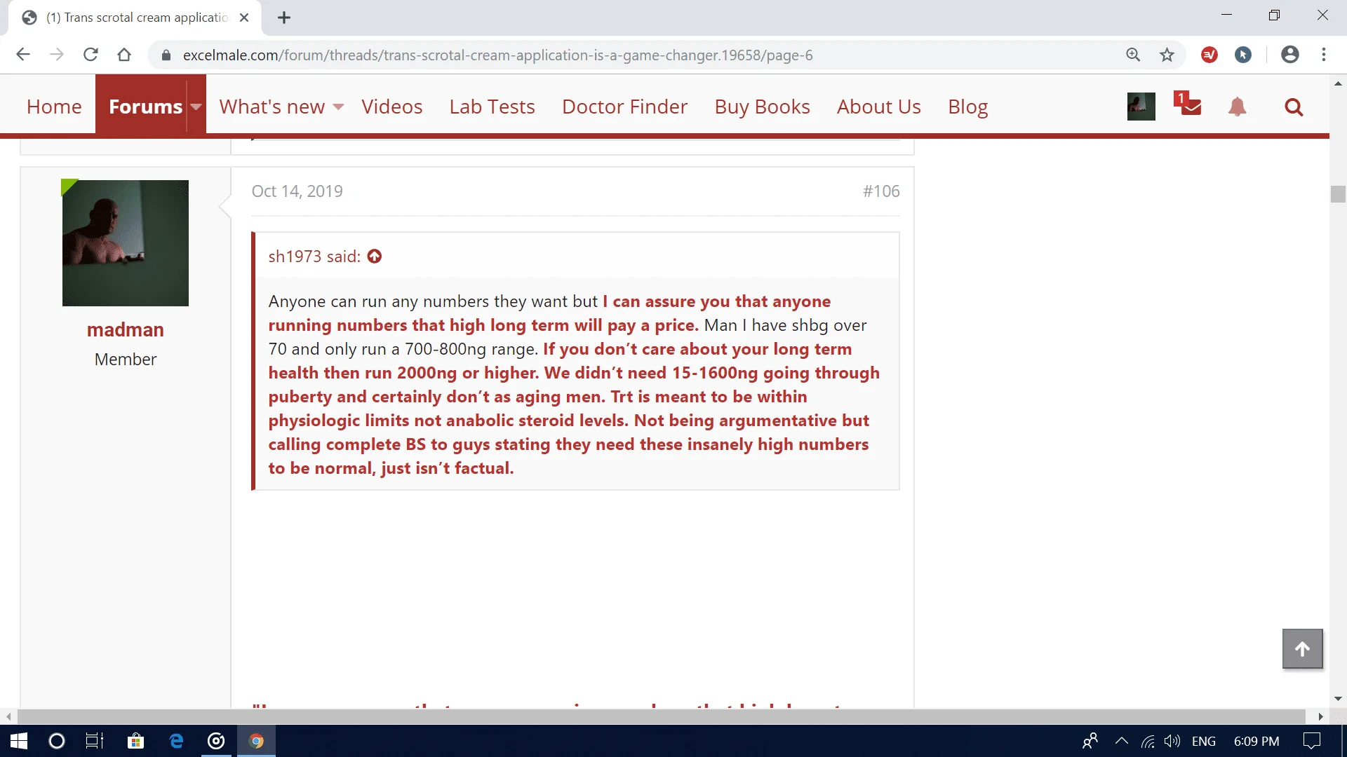 "I can assure you that anyone running numbers that high long term will pay a price".....1500-1600 ng/dl