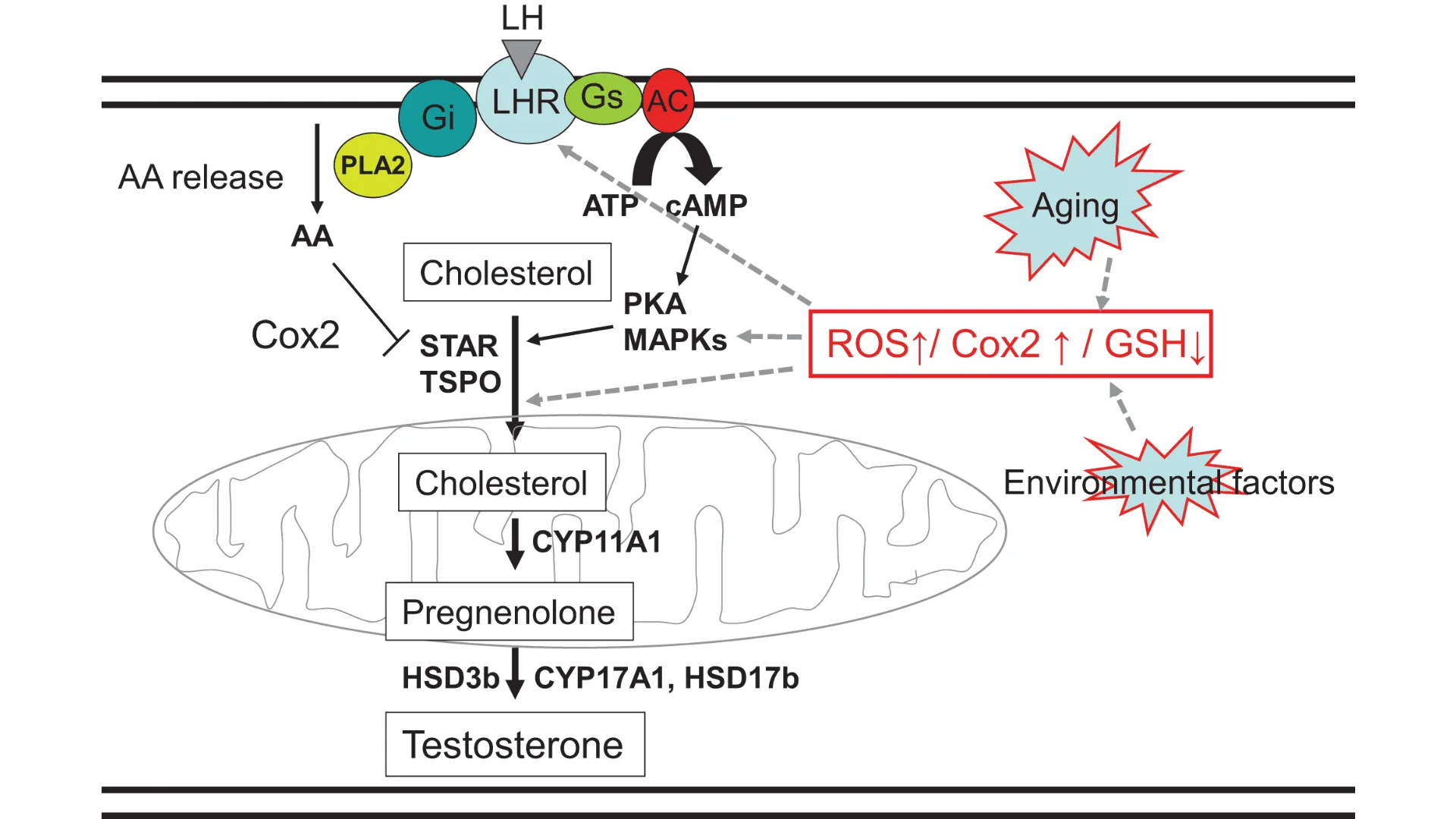 LH binds its receptor on the Leydig cell membrane. LH receptor/G protein coupling results in increased cAMP and arachidonic acid (AA) production. cAMP stimulates the mobilization and transport of cholesterol to and into the mitochondria in part by activating PKA and MAPK signaling. At the same time, AA can be converted into prostaglandin by Cox2 to negatively regulate the transport of cholesterol across the mitochondrial membranes. At the inner mitochondrial membrane, cholesterol is converted to pregnenolone by CYP11A1, and pregnenolone is converted into testosterone by enzymes in the smooth endoplasmic reticulum (HSD3b, CYP17A1, and HSD17b). Aging and environmental factors may impact steroidogenesis by affecting the intracellular redox balance in part through increased ROS production. This has significant effects on the cAMP formation and/or cholesterol transport into the mitochondria, and thus on steroid formation. Steroidogenesis also might be affected by ROS-induced increases in Cox2 production and redox-sensitive MAPK activation.