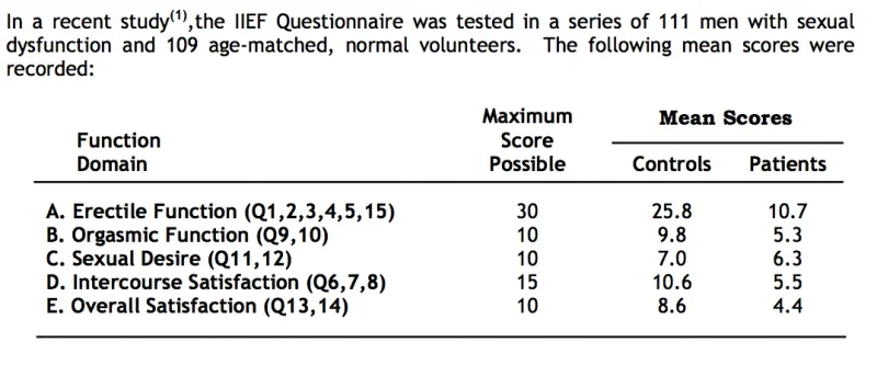 The 15-question International Index of Erectile Function (IIEF) Questionnaire is a validated, multi-dimensional, self-administered investigation that has been found useful in the clinical assessment of erectile dysfunction and treatment outcomes in clinical trials. A score of 0-5 is awarded to each of the 15 questions that examine the 4 main domains of male sexual function: erectile function, orgasmic function, sexual desire and intercourse satisfaction.